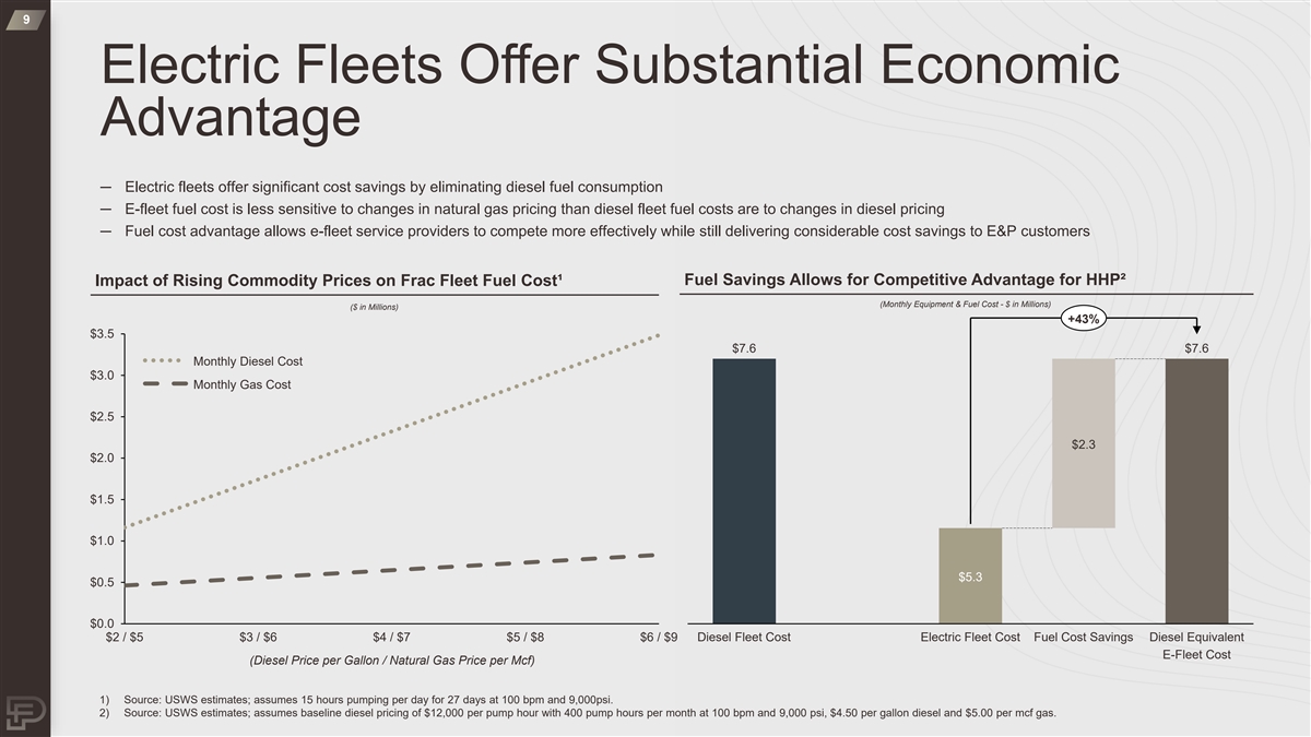 8 Combined Company Operations Snapshot ProFrac Fleet Locations Pro Forma Operational Footprint 1 fleet 4 fleets 13 fleets 6 fleets 7 fleets Permian Eagle Ford East TX/LA Appalachia Mid-Continent USWS Fleet Locations 1 fleet (1) Operating Locations 1 fleet 4 fleets ProFrac ProFrac Headquarters USWS USWS Headquarters Appalachia Permian Rockies 1) Includes corporate offices, service locations and storage yards