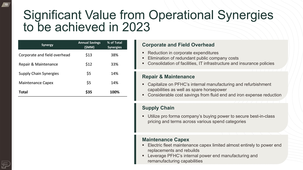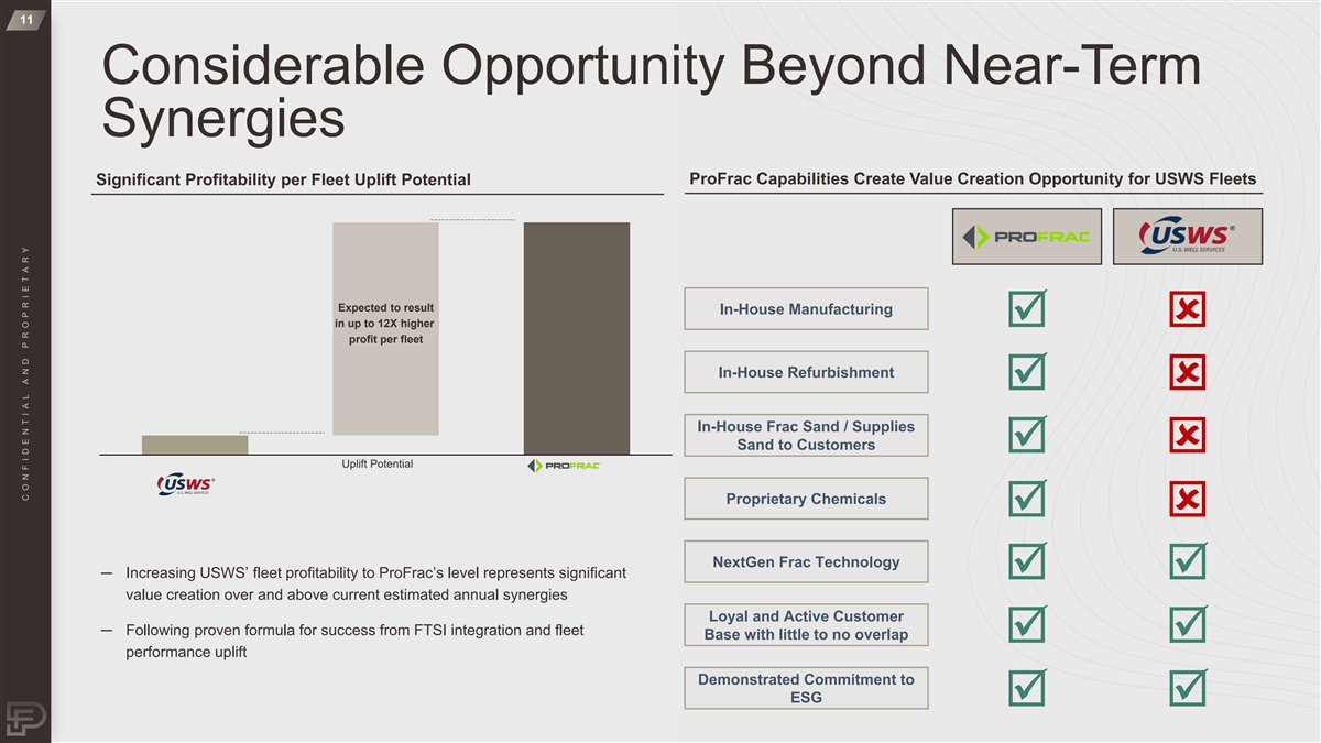 10 Significant Value from Operational Synergies to be achieved in 2023 Annual Savings % of Total Synergy Corporate and Field Overhead ($MM) Synergies § Reduction in corporate expenditures Corporate and field overhead $13 38% § Elimination of redundant public company costs § Consolidation of facilities, IT infrastructure and insurance policies Repair & Maintenance $12 33% Supply Chain Synergies $5 14% Repair & Maintenance Maintenance Capex $5 14% § Capitalize on PFHC’s internal manufacturing and refurbishment capabilities as well as spare horsepower Total $35 100% § Considerable cost savings from fluid end and iron expense reduction Supply Chain § Utilize pro forma company’s buying power to secure best-in-class pricing and terms across various spend categories Maintenance Capex § Electric fleet maintenance capex limited almost entirely to power end replacements and rebuilds § Leverage PFHC’s internal power end manufacturing and remanufacturing capabilities