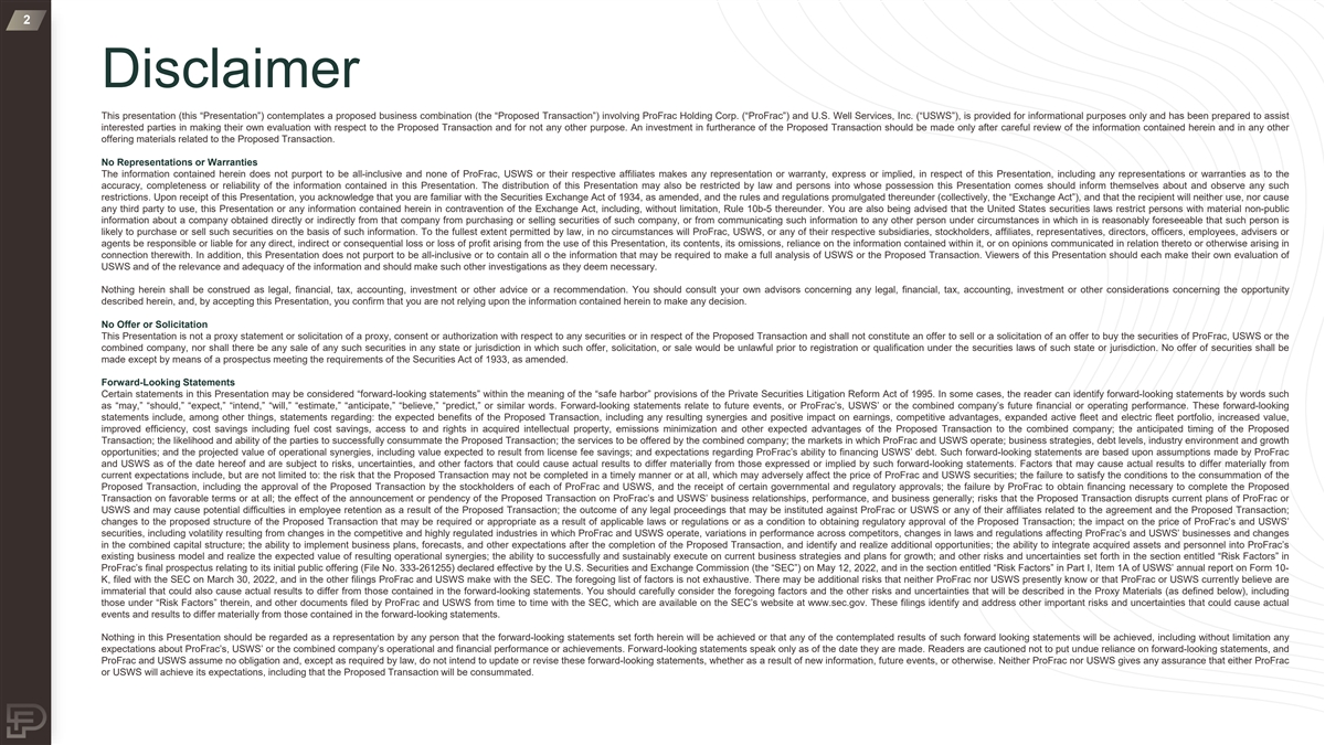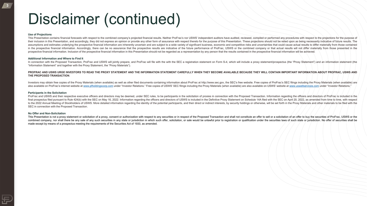 2 Disclaimer This presentation (this “Presentation”) contemplates a proposed business combination (the “Proposed Transaction”) involving ProFrac Holding Corp. (“ProFrac”) and U.S. Well Services, Inc. (“USWS”), is provided for informational purposes only and has been prepared to assist interested parties in making their own evaluation with respect to the Proposed Transaction and for not any other purpose. An investment in furtherance of the Proposed Transaction should be made only after careful review of the information contained herein and in any other offering materials related to the Proposed Transaction. No Representations or Warranties The information contained herein does not purport to be all-inclusive and none of ProFrac, USWS or their respective affiliates makes any representation or warranty, express or implied, in respect of this Presentation, including any representations or warranties as to the accuracy, completeness or reliability of the information contained in this Presentation. The distribution of this Presentation may also be restricted by law and persons into whose possession this Presentation comes should inform themselves about and observe any such restrictions. Upon receipt of this Presentation, you acknowledge that you are familiar with the Securities Exchange Act of 1934, as amended, and the rules and regulations promulgated thereunder (collectively, the “Exchange Act”), and that the recipient will neither use, nor cause any third party to use, this Presentation or any information contained herein in contravention of the Exchange Act, including, without limitation, Rule 10b-5 thereunder. You are also being advised that the United States securities laws restrict persons with material non-public information about a company obtained directly or indirectly from that company from purchasing or selling securities of such company, or from communicating such information to any other person under circumstances in which in is reasonably foreseeable that such person is likely to purchase or sell such securities on the basis of such information. To the fullest extent permitted by law, in no circumstances will ProFrac, USWS, or any of their respective subsidiaries, stockholders, affiliates, representatives, directors, officers, employees, advisers or agents be responsible or liable for any direct, indirect or consequential loss or loss of profit arising from the use of this Presentation, its contents, its omissions, reliance on the information contained within it, or on opinions communicated in relation thereto or otherwise arising in connection therewith. In addition, this Presentation does not purport to be all-inclusive or to contain all o the information that may be required to make a full analysis of USWS or the Proposed Transaction. Viewers of this Presentation should each make their own evaluation of USWS and of the relevance and adequacy of the information and should make such other investigations as they deem necessary. Nothing herein shall be construed as legal, financial, tax, accounting, investment or other advice or a recommendation. You should consult your own advisors concerning any legal, financial, tax, accounting, investment or other considerations concerning the opportunity described herein, and, by accepting this Presentation, you confirm that you are not relying upon the information contained herein to make any decision. No Offer or Solicitation This Presentation is not a proxy statement or solicitation of a proxy, consent or authorization with respect to any securities or in respect of the Proposed Transaction and shall not constitute an offer to sell or a solicitation of an offer to buy the securities of ProFrac, USWS or the combined company, nor shall there be any sale of any such securities in any state or jurisdiction in which such offer, solicitation, or sale would be unlawful prior to registration or qualification under the securities laws of such state or jurisdiction. No offer of securities shall be made except by means of a prospectus meeting the requirements of the Securities Act of 1933, as amended. Forward-Looking Statements Certain statements in this Presentation may be considered “forward-looking statements” within the meaning of the “safe harbor” provisions of the Private Securities Litigation Reform Act of 1995. In some cases, the reader can identify forward-looking statements by words such as “may,” “should,” “expect,” “intend,” “will,” “estimate,” “anticipate,” “believe,” “predict,” or similar words. Forward-looking statements relate to future events, or ProFrac’s, USWS’ or the combined company’s future financial or operating performance. These forward-looking statements include, among other things, statements regarding: the expected benefits of the Proposed Transaction, including any resulting synergies and positive impact on earnings, competitive advantages, expanded active fleet and electric fleet portfolio, increased value, improved efficiency, cost savings including fuel cost savings, access to and rights in acquired intellectual property, emissions minimization and other expected advantages of the Proposed Transaction to the combined company; the anticipated timing of the Proposed Transaction; the likelihood and ability of the parties to successfully consummate the Proposed Transaction; the services to be offered by the combined company; the markets in which ProFrac and USWS operate; business strategies, debt levels, industry environment and growth opportunities; and the projected value of operational synergies, including value expected to result from license fee savings; and expectations regarding ProFrac’s ability to financing USWS’ debt. Such forward-looking statements are based upon assumptions made by ProFrac and USWS as of the date hereof and are subject to risks, uncertainties, and other factors that could cause actual results to differ materially from 
