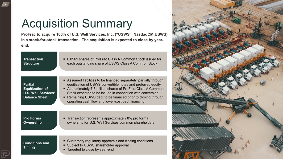 3 Disclaimer (continued) Use of Projections This Presentation contains financial forecasts with respect to the combined company’s projected financial results. Neither ProFrac’s nor USWS’ independent auditors have audited, reviewed, compiled or performed any procedures with respect to the projections for the purpose of their inclusion in this Presentation, and accordingly, they did not express an opinion or provide any other form of assurance with respect thereto for the purpose of this Presentation. These projections should not be relied upon as being necessarily indicative of future results. The assumptions and estimates underlying the prospective financial information are inherently uncertain and are subject to a wide variety of significant business, economic and competitive risks and uncertainties that could cause actual results to differ materially from those contained in the prospective financial information. Accordingly, there can be no assurance that the prospective results are indicative of the future performance of ProFrac, USWS or the combined company or that actual results will not differ materially from those presented in the prospective financial information. Inclusion of the prospective financial information in this Presentation should not be regarded as a representation by any person that the results contained in the prospective financial information will be achieved. Additional Information and Where to Find It In connection with the Proposed Transaction, ProFrac and USWS will jointly prepare, and ProFrac will file with the with the SEC a registration statement on Form S-4, which will include a proxy statement/prospectus (the “Proxy Statement”) and an information statement (the “Information Statement” and together with the Proxy Statement, the “Proxy Materials”). PROFRAC AND USWS URGE INVESTORS TO READ THE PROXY STATEMENT AND THE INFORMATION STATEMENT CAREFULLY WHEN THEY BECOME AVAILABLE BECAUSE THEY WILL CONTAIN IMPORTANT INFORMATION ABOUT PROFRAC, USWS AND THE PROPOSED TRANSACTION. Investors may obtain free copies of the Proxy Materials (when available) as well as other filed documents containing information about ProFrac at http://www.sec.gov, the SEC’s free website. Free copies of ProFrac’s SEC filings including the Proxy Materials (when available) are also available on ProFrac’s internet website at www.pfholdingscorp.com under “Investor Relations.” Free copies of USWS’ SEC filings including the Proxy Materials (when available) are also available on USWS’ website at www.uswellservices.com under “Investor Relations.” Participants in the Solicitation ProFrac and USWS and their respective executive officers and directors may be deemed, under SEC rules, to be participants in the solicitation of proxies in connection with the Proposed Transaction. Information regarding the officers and directors of ProFrac is included in the final prospectus filed pursuant to Rule 424(b) with the SEC on May 16, 2022. Information regarding the officers and directors of USWS is included in the Definitive Proxy Statement on Schedule 14A filed with the SEC on April 20, 2022, as amended from time to time, with respect to the 2022 Annual Meeting of Stockholders of USWS. More detailed information regarding the identity of the potential participants, and their direct or indirect interests, by security holdings or otherwise, will be set forth in the Proxy Materials and other materials to be filed with the SEC in connection with the Proposed Transaction. No Offer and Non-Solicitation This Presentation is not a proxy statement or solicitation of a proxy, consent or authorization with respect to any securities or in respect of the Proposed Transaction and shall not constitute an offer to sell or a solicitation of an offer to buy the securities of ProFrac, USWS or the combined company, nor shall there be any sale of any such securities in any state or jurisdiction in which such offer, solicitation, or sale would be unlawful prior to registration or qualification under the securities laws of such state or jurisdiction. No offer of securities shall be made except by means of a prospectus meeting the requirements of the Securities Act of 1933, as amended.