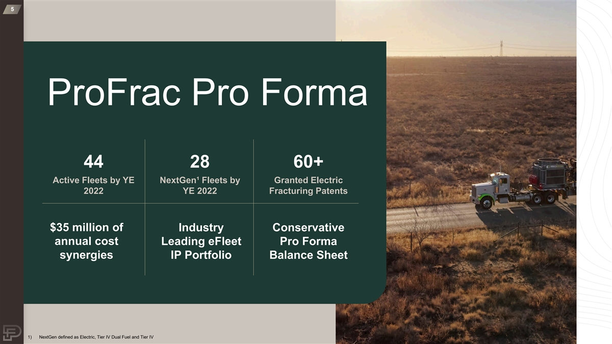 4 Acquisition Summary ProFrac to acquire 100% of U.S. Well Services, Inc. (“USWS”, NasdaqCM:USWS) in a stock-for-stock transaction. The acquisition is expected to close by year- end. Transaction § 0.0561 shares of ProFrac Class A Common Stock issued for Structure each outstanding share of USWS Class A Common Stock § Assumed liabilities to be financed separately, partially through Partial equitization of USWS convertible notes and preferred equity Equitization of § Approximately 7.5 million shares of ProFrac Class A Common U.S. Well Services’ Stock expected to be issued in connection with conversion Balance Sheet¹§ Remaining USWS debt to be financed prior to closing through operating cash flow and lower-cost debt financing Pro Forma § Transaction represents approximately 8% pro forma Ownership ownership for U.S. Well Services common shareholders § Customary regulatory approvals and closing conditions Conditions and § Subject to USWS shareholder approval Timing § Targeted to close by year-end