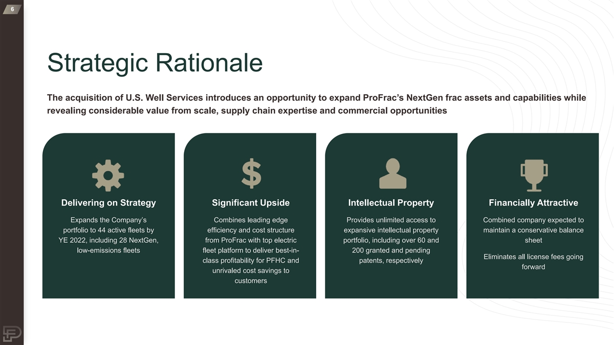 5 ProFrac Pro Forma 44 28 60+ Active Fleets by YE NextGen¹ Fleets by Granted Electric 2022 YE 2022 Fracturing Patents $35 million of Industry Conservative annual cost Leading eFleet Pro Forma synergies IP Portfolio Balance Sheet 1) NextGen defined as Electric, Tier IV Dual Fuel and Tier IV