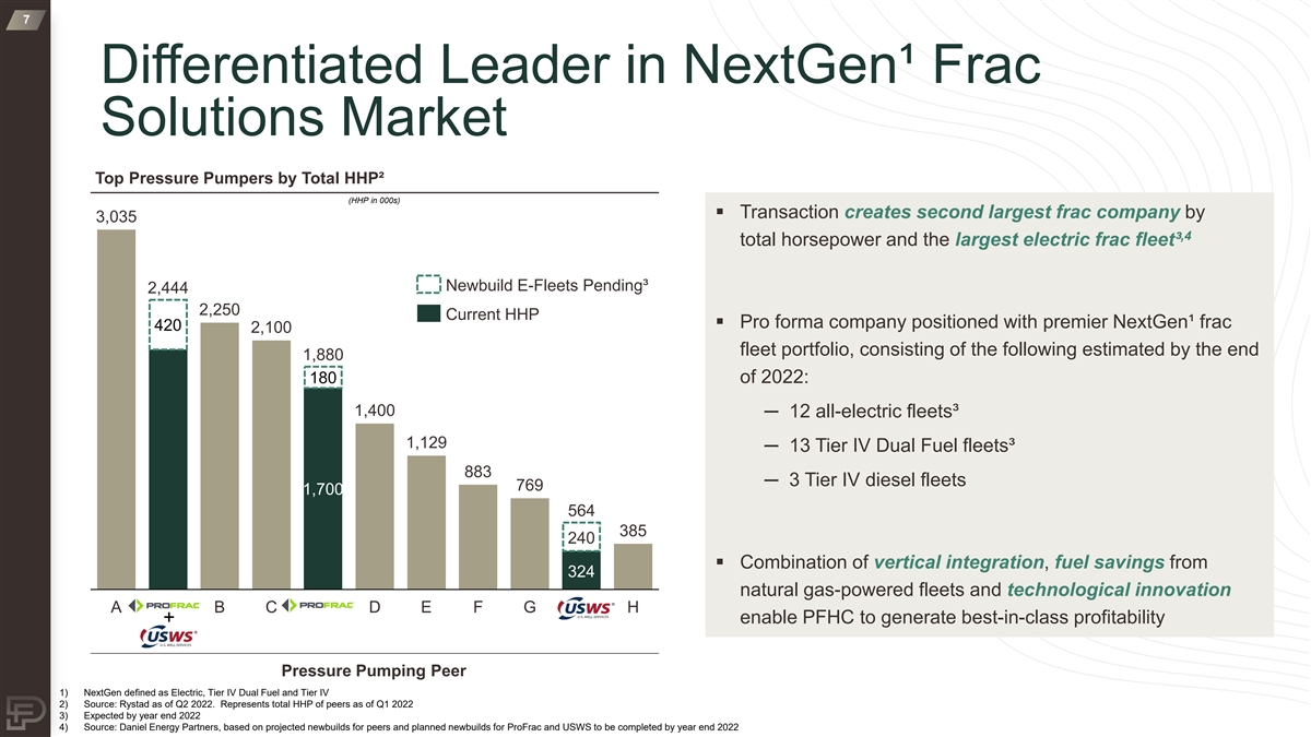 6 Strategic Rationale The acquisition of U.S. Well Services introduces an opportunity to expand ProFrac’s NextGen frac assets and capabilities while revealing considerable value from scale, supply chain expertise and commercial opportunities Delivering on Strategy Significant Upside Intellectual Property Financially Attractive Expands the Company’s Combines leading edge Provides unlimited access to Combined company expected to portfolio to 44 active fleets by efficiency and cost structure expansive intellectual property maintain a conservative balance YE 2022, including 28 NextGen, from ProFrac with top electric portfolio, including over 60 and sheet low-emissions fleets fleet platform to deliver best-in- 200 granted and pending Eliminates all license fees going class profitability for PFHC and patents, respectively forward unrivaled cost savings to customers