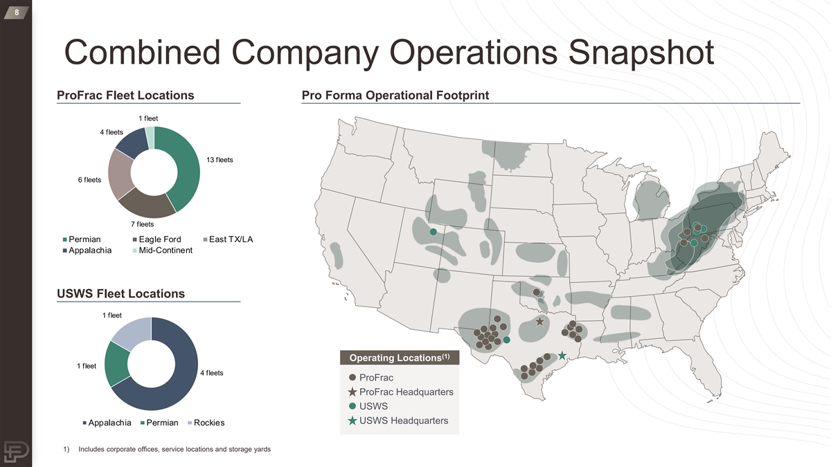 7 Differentiated Leader in NextGen¹ Frac Solutions Market Top Pressure Pumpers by Total HHP² (HHP in 000s) § Transaction creates second largest frac company by 3,035 ,4 total horsepower and the largest electric frac fleet³ Newbuild E-Fleets Pending³ 2,444 2,250 Current HHP § Pro forma company positioned with premier NextGen¹ frac 420 2,100 fleet portfolio, consisting of the following estimated by the end 1,880 180 of 2022: 1,400 ─ 12 all-electric fleets³ 1,129 ─ 13 Tier IV Dual Fuel fleets³ 883 ─ 3 Tier IV diesel fleets 769 1,700 564 385 240 § Combination of vertical integration, fuel savings from 324 natural gas-powered fleets and technological innovation A B C D E F G H enable PFHC to generate best-in-class profitability + Pressure Pumping Peer 1) NextGen defined as Electric, Tier IV Dual Fuel and Tier IV 2) Source: Rystad as of Q2 2022. Represents total HHP of peers as of Q1 2022 3) Expected by year end 2022 4) Source: Daniel Energy Partners, based on projected newbuilds for peers and planned newbuilds for ProFrac and USWS to be completed by year end 2022
