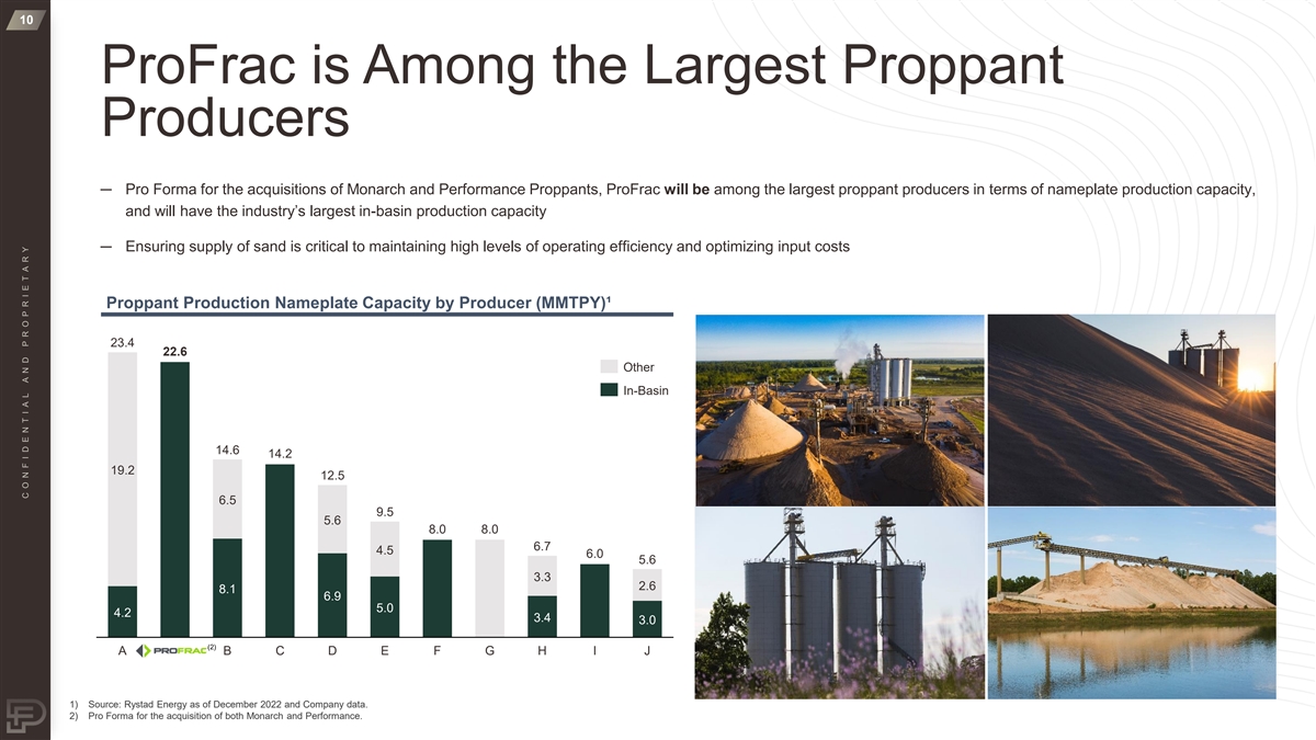 9 Acquisitions Offer Scale and Significant Margin Contribution ▪ Owning in-basin mines eliminates margin paid to proppant suppliers, minimizing leakage of value to third parties ▪ Ability to realize logistics margin on volumes sold to ProFrac or to third parties FOB wellsite offers potentially significant incremental value ▪ Capturing proppant and logistics margin facilitates the optimization of profitability and enhances ability to maintain high levels of fleet utilization Illustrative Potential Cost Savings From Internally Sourcing Proppant¹ 60% 63% 56% 48% Permian Eagle Ford Haynesville Pro Forma ProFrac Production Cost Margin Permian Eagle Ford (Pro Forma) Haynesville (Pro Forma) Pro Forma ProFrac Production Capacity (MMtpy) 8.3 3.9 10.4 22.6 Implied Potential Fleets 16.6 7.8 20.8 45.2 Accommodated² Potential Cost Savings³ 63% 60% 48% 56% 1) Source: ProFrac management estimates for FOB mine prices; illustrative production costs. 2) Assumes 500 thousand tons per year demand per active frac fleet. 3) Reflects difference between production cost of tons produced and cost of volumes if purchased at FOB minegate prices.