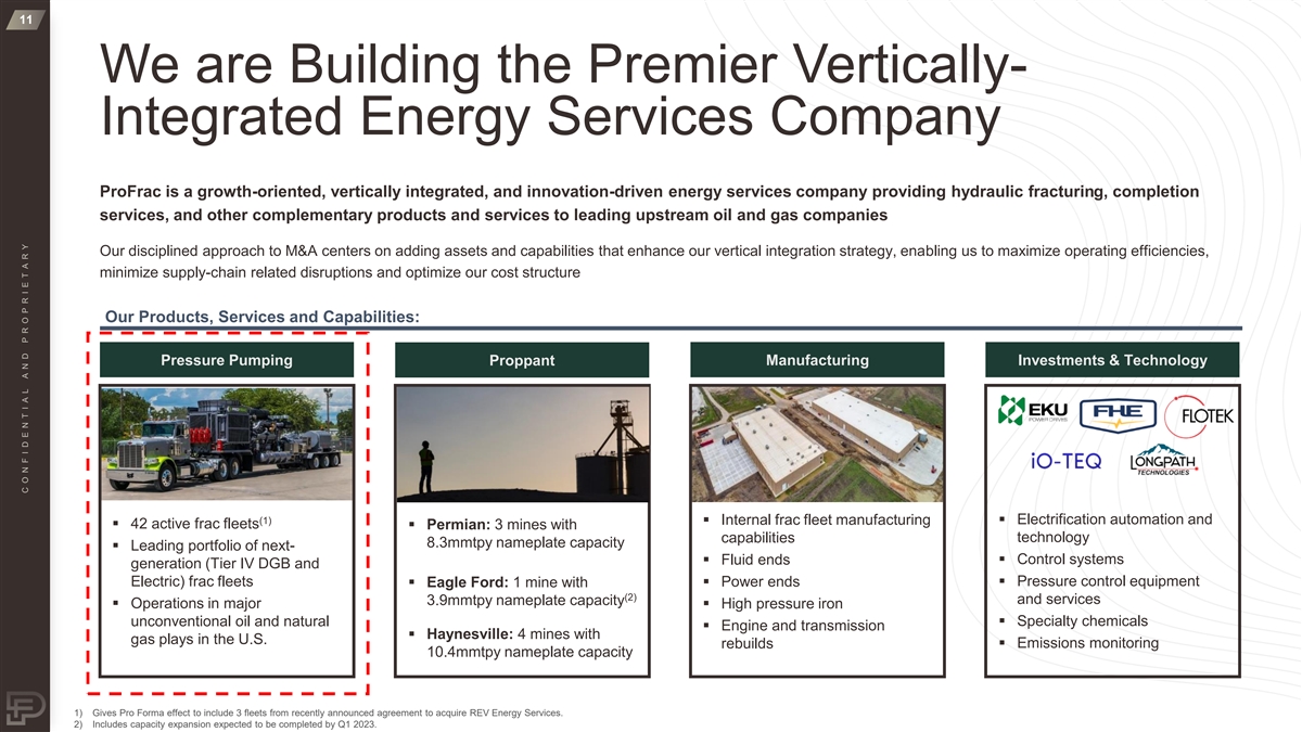 10 ProFrac is Among the Largest Proppant Producers ─ Pro Forma for the acquisitions of Monarch and Performance Proppants, ProFrac will be among the largest proppant producers in terms of nameplate production capacity, and will have the industry’s largest in-basin production capacity ─ Ensuring supply of sand is critical to maintaining high levels of operating efficiency and optimizing input costs Proppant Production Nameplate Capacity by Producer (MMTPY)¹ 23.4 22.6 Other In-Basin 14.6 14.2 19.2 12.5 6.5 9.5 5.6 8.0 8.0 6.7 4.5 6.0 5.6 3.3 2.6 8.1 6.9 5.0 4.2 3.4 3.0 (2) A B C D E F G H I J 1) Source: Rystad Energy as of December 2022 and Company data. 2) Pro Forma for the acquisition of both Monarch and Performance. C O N F I D E N T I A L A N D P R O P R I E T A R Y