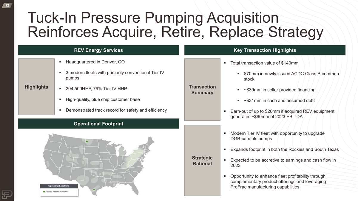 11 We are Building the Premier Vertically- Integrated Energy Services Company ProFrac is a growth-oriented, vertically integrated, and innovation-driven energy services company providing hydraulic fracturing, completion services, and other complementary products and services to leading upstream oil and gas companies Our disciplined approach to M&A centers on adding assets and capabilities that enhance our vertical integration strategy, enabling us to maximize operating efficiencies, minimize supply-chain related disruptions and optimize our cost structure Our Products, Services and Capabilities: Pressure Pumping Proppant Manufacturing Investments & Technology (1)▪ Internal frac fleet manufacturing ▪ Electrification automation and ▪ 42 active frac fleets ▪ Permian: 3 mines with capabilities technology 8.3mmtpy nameplate capacity ▪ Leading portfolio of next- ▪ Control systems ▪ Fluid ends generation (Tier IV DGB and Electric) frac fleets▪ Eagle Ford: 1 mine with ▪ Power ends▪ Pressure control equipment (2) and services 3.9mmtpy nameplate capacity ▪ Operations in major ▪ High pressure iron unconventional oil and natural ▪ Specialty chemicals ▪ Engine and transmission ▪ Haynesville: 4 mines with gas plays in the U.S. ▪ Emissions monitoring rebuilds 10.4mmtpy nameplate capacity 1) Gives Pro Forma effect to include 3 fleets from recently announced agreement to acquire REV Energy Services. 2) Includes capacity expansion expected to be completed by Q1 2023. C O N F I D E N T I A L A N D P R O P R I E T A R Y