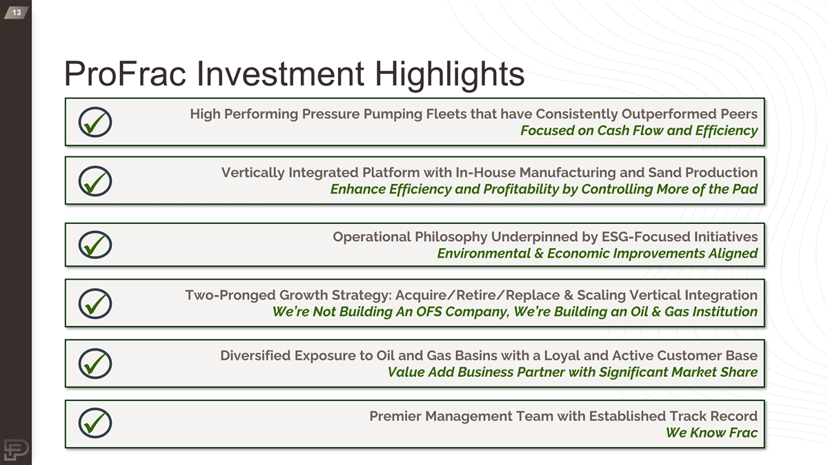 12 Tuck-In Pressure Pumping Acquisition Reinforces Acquire, Retire, Replace Strategy REV Energy Services Key Transaction Highlights ▪ Headquartered in Denver, CO ▪ Total transaction value of $140mm ▪ 3 modern fleets with primarily conventional Tier IV ▪ $70mm in newly issued ACDC Class B common pumps stock Highlights Transaction ▪ 204,500HHP, 79% Tier IV HHP ▪ ~$39mm in seller provided financing Summary ▪ High-quality, blue chip customer base ▪ ~$31mm in cash and assumed debt ▪ Demonstrated track record for safety and efficiency ▪ Earn-out of up to $20mm if acquired REV equipment generates ~$90mm of 2023 EBITDA Operational Footprint ▪ Modern Tier IV fleet with opportunity to upgrade DGB-capable pumps ▪ Expands footprint in both the Rockies and South Texas Strategic ▪ Expected to be accretive to earnings and cash flow in Rational 2023 ▪ Opportunity to enhance fleet profitability through complementary product offerings and leveraging ProFrac manufacturing capabilities