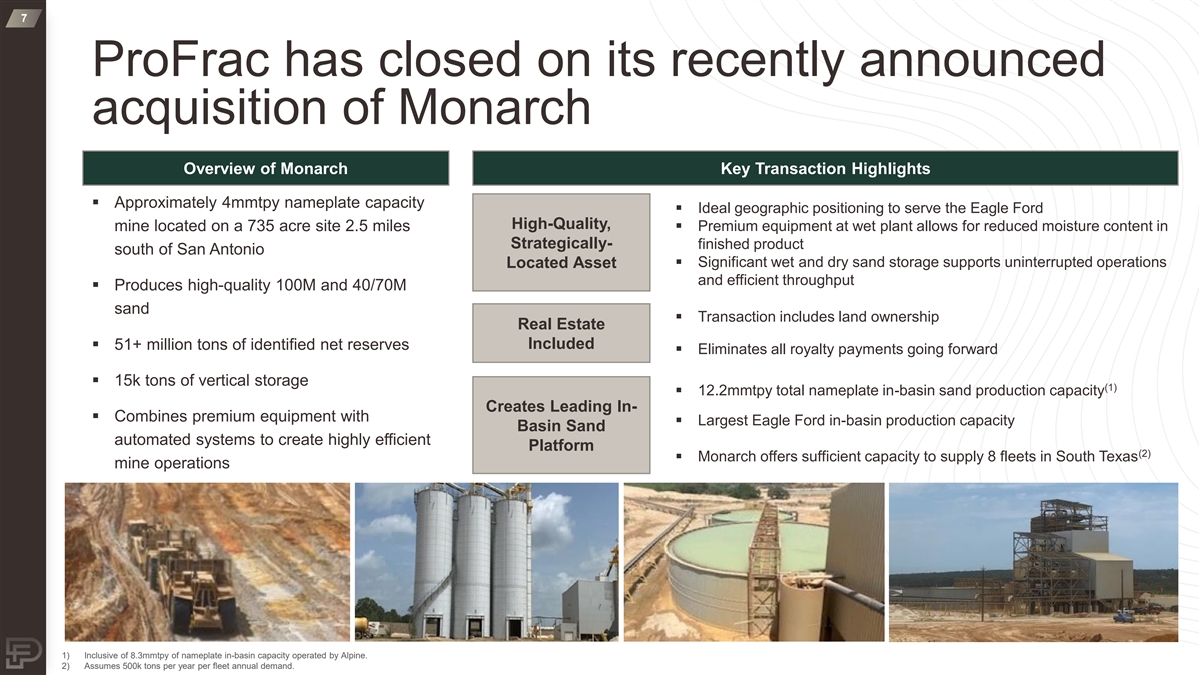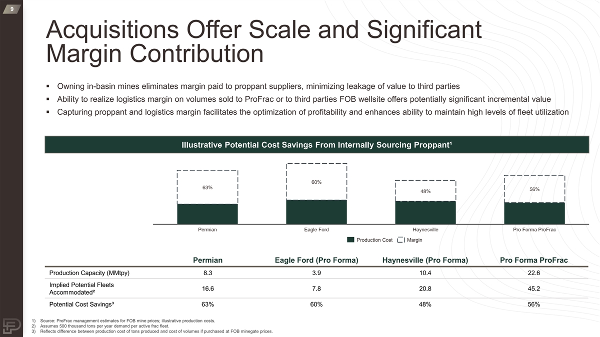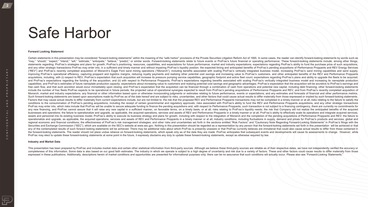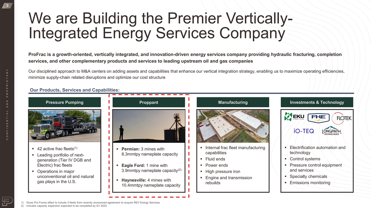 2 Safe Harbor Forward Looking Statement Certain statements in this presentation may be considered “forward-looking statements” within the meaning of the “safe harbor” provisions of the Private Securities Litigation Reform Act of 1995. In some cases, the reader can identify forward-looking statements by words such as “may,” “should,” “expect,” “intend,” “will,” “estimate,” “anticipate,” “believe,” “predict,” or similar words. Forward-looking statements relate to future events or ProFrac’s future financial or operating performance. These forward-looking statements include, among other things, statements regarding: ProFrac’s strategies and plans for growth; ProFrac’s positioning, resources, capabilities, and expectations for future performance; market and industry expectations; expectations regarding ProFrac’s ability to fund the purchase price of such acquisitions, and any other strategic transactions ProFrac may enter into, in a sufficient and timely manner and without impairing ProFrac’s liquidity position; the expected timing and anticipated benefits of ProFrac’s pending acquisitions of Performance Proppants and REV Energy Services (“REV”) and ProFrac’s recently completed acquisition of Monarch’s Eagle Ford sand mining operations (“Monarch”), including benefits associated with scaling ProFrac’s vertically integrated business model, increasing ProFrac’s sand mining capabilities and sand supply, improving ProFrac’s operational efficiency, capturing proppant and logistics margins, reducing royalty payments and realizing other potential cost savings and increasing value to ProFrac’s customers, and other anticipated benefits of the REV and Performance Proppants acquisitions, including, with (i) respect to REV, ProFrac’s expectation that such acquisition will increase its pressure pumping service capabilities, geographic footprint and active fleet count; expectations regarding ProFrac’s plans and ability to upgrade the fleets to be acquired; and ProFrac’s expectations regarding the funding of the acquisition; and (ii) with respect to Performance Proppants, ProFrac’s expectations regarding benefits associated with scaling ProFrac's vertically integrated business model and increasing its nameplate production capabilities, and ProFrac’s estimates of future nameplate production capacity; expectations about increasing value to customers and realizing potential cost savings and geographic advantages; ProFrac’s expectation that the acquisition will be accretive to ProFrac’s earnings and free cash flow, and that such accretion would occur immediately upon closing; and ProFrac’s expectation that the acquisition can be financed through a combination of cash from operations and potential new capital, including debt financing; other forward-looking statements include the number of frac fleets ProFrac expects to be operational in future periods; the projected value of operational synergies expected to result from ProFrac’s pending acquisitions of Performance Proppants and REV, and from ProFrac’s recently completed acquisition of Monarch; market and industry expectations; any financial or other information based upon or otherwise incorporating judgments or estimates relating to future performance, events or expectations; and any estimates and forecasts of financial and other performance metrics. Such forward-looking statements are based upon assumptions made by ProFrac as of the date hereof and are subject to risks, uncertainties, and other factors that could cause actual results to differ materially from those expressed or implied by such forward-looking statements. Factors that may cause actual results to differ materially from current expectations include, but are not limited to: the risk that the proposed REV and Performance Proppants transactions may not be completed in a timely manner or at all; risks relating to the failure to satisfy the conditions to the consummation of ProFrac’s pending acquisitions, including the receipt of certain governmental and regulatory approvals; risks associated with ProFrac's ability to fund the REV and Performance Proppants acquisitions, and any other strategic transactions ProFrac may enter into, which risks include that ProFrac will be unable to secure adequate funding to finance the pending acquisitions and, with respect to Performance Proppants, such transaction is not subject to a financing contingency, there are currently no commitments for any new financing, and ProFrac cannot assure that it will raise any new capital in a sufficient manner, on favorable terms, on a timely basis, or at all; risks relating to ProFrac’s liquidity needs; the risk that Company will not realize the anticipated benefits of the acquired businesses and operations; the failure to operationalize and upgrade, as applicable, the acquired operations, services and assets of REV and Performance Proppants in a timely manner or at all; ProFrac’s ability to effectively scale its operations and integrate acquired services, assets and personnel into its existing business model; ProFrac’s ability to execute its business strategy and plans for growth, including with respect to the integration of Monarch and the completion of the pending acquisitions of Performance Proppants and REV; the failure to operationalize and upgrade, as applicable, the acquired operations, services and assets of REV and Performance Proppants in a timely manner or at all; industry conditions, including fluctuations in supply, demand and prices for ProFrac’s products and services; global and regional economic and financial conditions; the effectiveness of ProFrac’s risk management strategies; and other risks and uncertainties set forth in the sections entitled “Risk Factors” and “Cautionary Note Regarding Forward-Looking Statements” in ProFrac’s filings with the Securities and Exchange Commission (“SEC”), wh