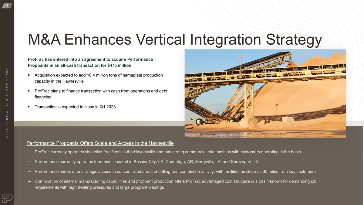 3 We are Building the Premier Vertically- Integrated Energy Services Company ProFrac is a growth-oriented, vertically integrated, and innovation-driven energy services company providing hydraulic fracturing, completion services, and other complementary products and services to leading upstream oil and gas companies Our disciplined approach to M&A centers on adding assets and capabilities that enhance our vertical integration strategy, enabling us to maximize operating efficiencies, minimize supply-chain related disruptions and optimize our cost structure Our Products, Services and Capabilities: Pressure Pumping Proppant Manufacturing Investments & Technology (1)▪ Internal frac fleet manufacturing ▪ Electrification automation and ▪ 42 active frac fleets ▪ Permian: 3 mines with capabilities technology 8.3mmtpy nameplate capacity ▪ Leading portfolio of next- ▪ Control systems ▪ Fluid ends generation (Tier IV DGB and Electric) frac fleets▪ Eagle Ford: 1 mine with ▪ Power ends▪ Pressure control equipment (2) and services 3.9mmtpy nameplate capacity ▪ Operations in major ▪ High pressure iron unconventional oil and natural ▪ Specialty chemicals ▪ Engine and transmission ▪ Haynesville: 4 mines with gas plays in the U.S. ▪ Emissions monitoring rebuilds 10.4mmtpy nameplate capacity 1) Gives Pro Forma effect to include 3 fleets from recently announced agreement to acquire REV Energy Services. 2) Includes capacity expansion expected to be completed by Q1 2023. C O N F I D E N T I A L A N D P R O P R I E T A R Y