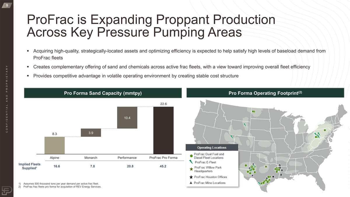 4 M&A Enhances Vertical Integration Strategy ProFrac has entered into an agreement to acquire Performance Proppants in an all-cash transaction for $475 million ▪ Acquisition expected to add 10.4 million tons of nameplate production capacity in the Haynesville ▪ ProFrac plans to finance transaction with cash from operations and debt financing ▪ Transaction is expected to close in Q1 2023 Performance Proppants Offers Scale and Access in the Haynesville ─ ProFrac currently operates six active frac fleets in the Haynesville and has strong commercial relationships with customers operating in the basin ─ Performance currently operates four mines located in Bossier City, LA; Doddridge, AR; Merryville, LA; and Shreveport, LA ─ Performance mines offer strategic access to concentrated areas of drilling and completion activity, with facilities as close as 30 miles from key customers ─ Combination of internal manufacturing capabilities and proppant production offers ProFrac advantaged cost structure in a basin known for demanding job requirements with high treating pressures and large proppant loadings C O N F I D E N T I A L A N D P R O P R I E T A R Y