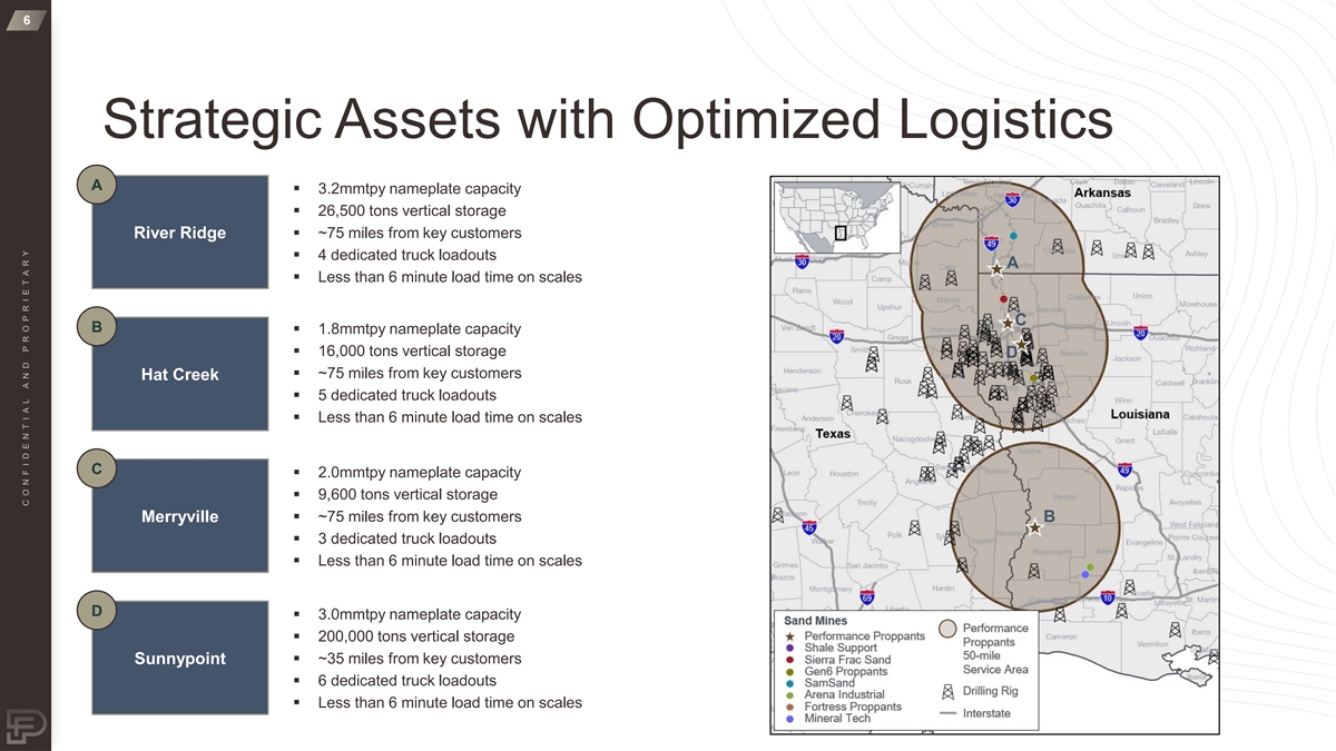5 ProFrac is Expanding Proppant Production Across Key Pressure Pumping Areas ▪ Acquiring high-quality, strategically-located assets and optimizing efficiency is expected to help satisfy high levels of baseload demand from ProFrac fleets ▪ Creates complementary offering of sand and chemicals across active frac fleets, with a view toward improving overall fleet efficiency ▪ Provides competitive advantage in volatile operating environment by creating stable cost structure (2) Pro Forma Sand Capacity (mmtpy) Pro Forma Operating Footprint 22.6 10.4 3.9 8.3 Alpine Monarch Performance ProFrac Pro Forma Implied Fleets 16.6 7.8 20.8 45.2 Supplied¹ 1) Assumes 500 thousand tons per year demand per active frac fleet. 2) ProFrac frac fleets pro forma for acquisition of REV Energy Services. C O N F I D E N T I A L A N D P R O P R I E T A R Y