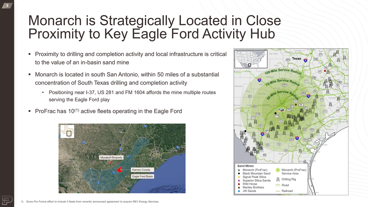 7 ProFrac has closed on its recently announced acquisition of Monarch Overview of Monarch Key Transaction Highlights ▪ Approximately 4mmtpy nameplate capacity ▪ Ideal geographic positioning to serve the Eagle Ford High-Quality, mine located on a 735 acre site 2.5 miles ▪ Premium equipment at wet plant allows for reduced moisture content in Strategically- finished product south of San Antonio ▪ Significant wet and dry sand storage supports uninterrupted operations Located Asset and efficient throughput ▪ Produces high-quality 100M and 40/70M sand ▪ Transaction includes land ownership Real Estate Included ▪ 51+ million tons of identified net reserves ▪ Eliminates all royalty payments going forward ▪ 15k tons of vertical storage (1) ▪ 12.2mmtpy total nameplate in-basin sand production capacity Creates Leading In- ▪ Combines premium equipment with ▪ Largest Eagle Ford in-basin production capacity Basin Sand automated systems to create highly efficient Platform (2) ▪ Monarch offers sufficient capacity to supply 8 fleets in South Texas mine operations 1) Inclusive of 8.3mmtpy of nameplate in-basin capacity operated by Alpine. 2) Assumes 500k tons per year per fleet annual demand.